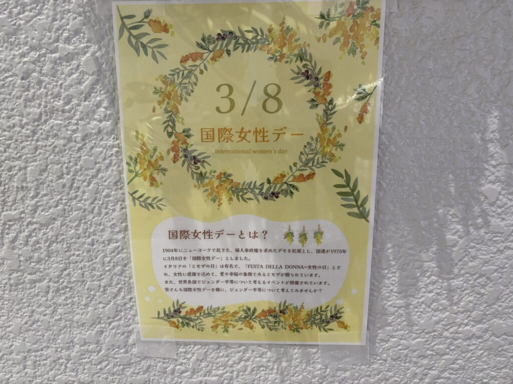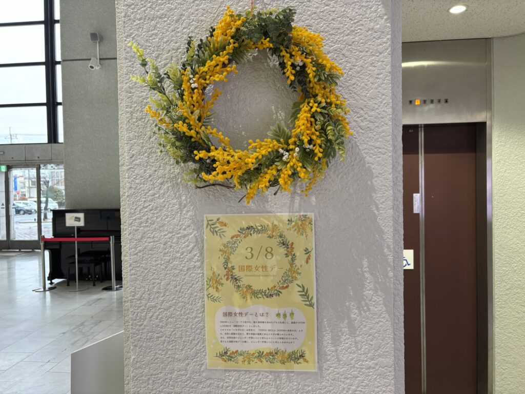 3月4日は国際女性デー 2026年2月25日 最終更新日時 : 2026年2月26日 kamoshida 市役所のロビーに、国際女性デーのシンボルである「ミモザ」のリースが掲示され、その意義が広報されています。担当の職員のアイデアとやさしさが感じられます。