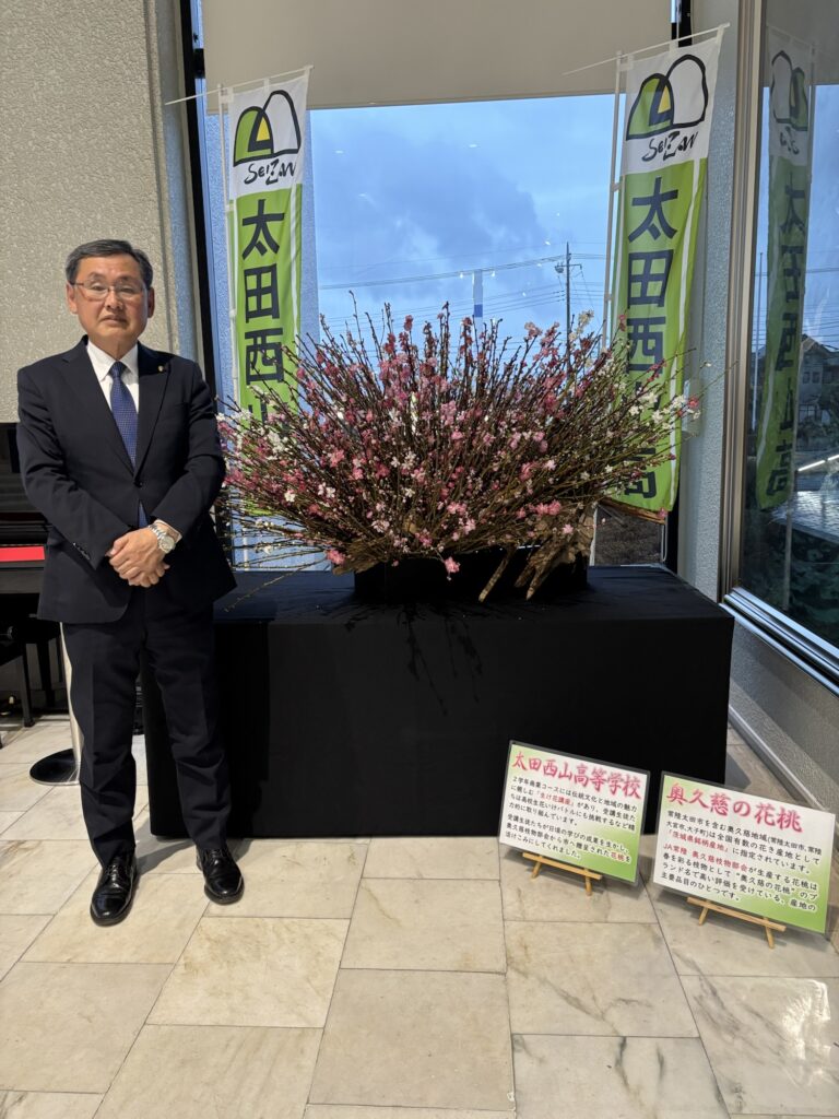 市役所のロビーに太田西山高校の生徒による花桃の生け込みが置かれています。JA常陸奥久慈枝物部会から寄贈された花桃を見事にダイナミックに生け込みされています。一歩早い春を感じる作品です。このすばらしい空間ができたことに、お世話になった多くの方々に感謝申し上げます。