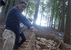 梵天山古墳で県内ではめずらしい河原石を吹き付けた調査結果の説明を受ける