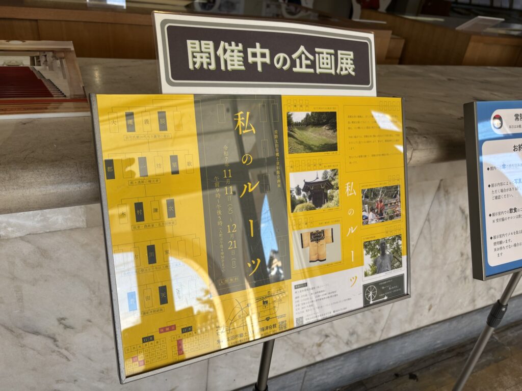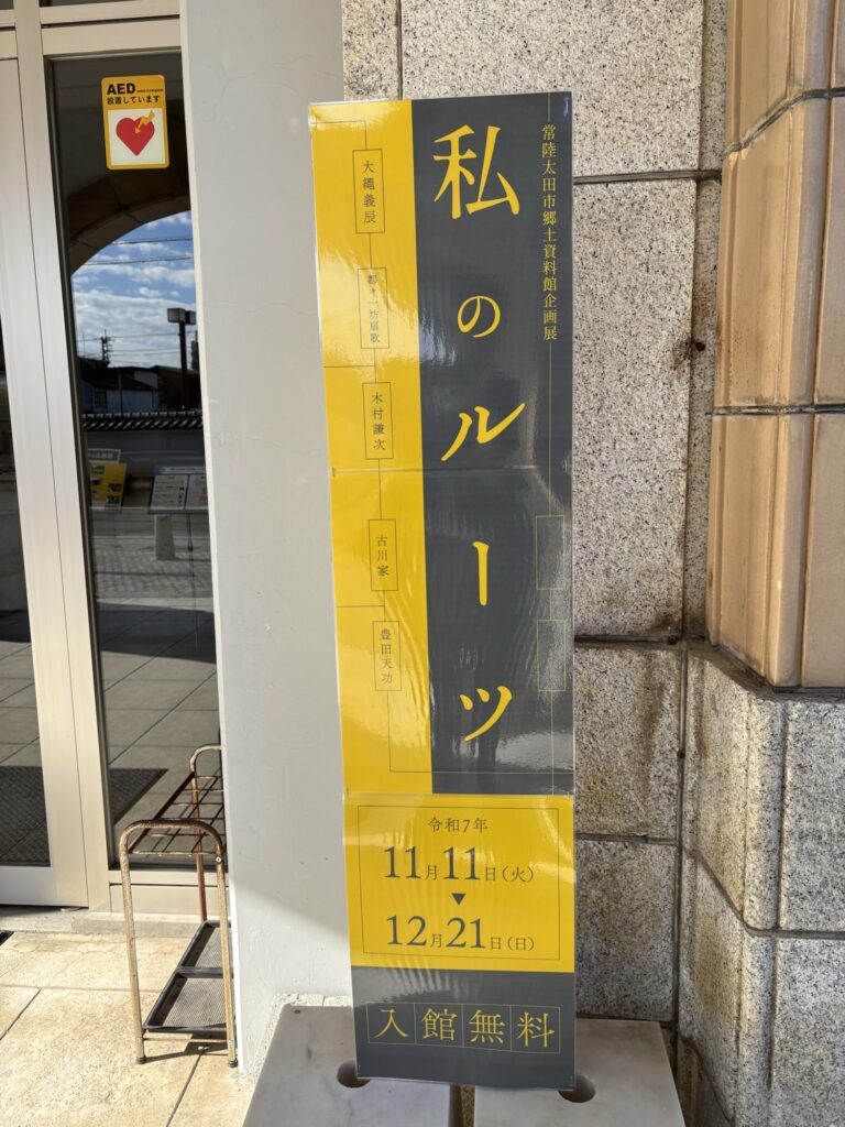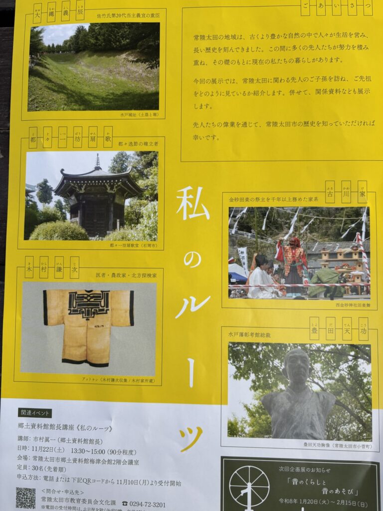 『私のルーツ』常陸太田市郷土資料館企画展に行ってきました 2025年12月9日 最終更新日時 : 2025年12月9日 kamoshida 常陸太田に関わる先人たちのご子孫を紹介している展示を見て来ました。しかも館長に会い、興味深い説明もいただきました。木村謙次・豊田天功・都々一坊扇歌などの紹介があり、貴重な資料もありました。12月21日まで。